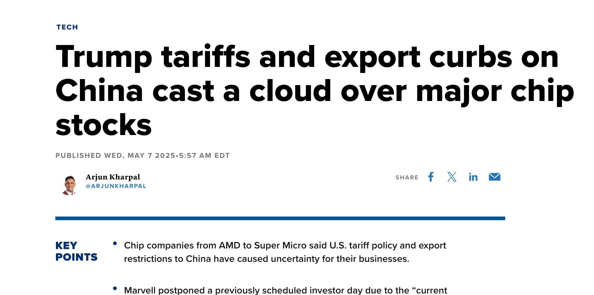本周二,AMD 表示,尽管第一季度盈利超出预期,但由于对中国人工智能芯片出口限制,预计本财年末将损失15亿美元。 超微也于当日发布了令人失望的财报,财报称业绩不达预期的原因是关税和宏观经济不确定性所导致的。该公司表示,在“前景”更加明朗之前,不会提供2026财年的财报。该股盘前交易下跌4%。 Marvell 也在当日表示,将原定于6月10日举行的投资者日活动推迟至“2026年的某日”。该公司股价在盘前交易中下跌了4.4%。Marvell首席执行官马特·墨菲 (Matt Murphy) 在一份声明中表示:“鉴于当前不确定的宏观经济环境,我们决定推迟投资者日召开的日期。” 今年,由于宏观经济不确定性增加和美国贸易政策的影响,半导体股一直承受压力。 从表现来看,微软等科技巨头在人工智能产品方面表现强劲,但市场对人工智能产品的需求仍存在担忧。 感受到压力的不仅仅是美国公司。 三星在上个月表示,由于关税政策变化和宏观经济不确定性,“预计需求波动将相当大”。三星高管在财报电话会议上表示:“由于主要国家政策的快速变化和地缘政治紧张局势,很难准确预测关税和反制措施对业务的影响。”“我们面临很多不确定性。” Quilter Cheviot全球技术分析师本·巴林杰 (Ben Barringer) 通过电子邮件告诉 CNBC:“半导体行业正面临复杂的需求信号和地缘政治逆风。” 巴林杰表示,Marvell推迟投资者日的决定“在缺乏明确性的情况下更增加了一层不确定性”,而超微的疲软前景也“令人担忧”。 巴林杰补充道:“由于宏观不确定性和出口限制仍然很大,即使某些领域的潜在需求保持稳定,芯片制造商的未来道路仍然坎坷。” 英伟达首席执行官黄仁勋周二向 CNBC 表示,中国可能在两到三年内成为一个价值 500 亿美元的人工智能市场。 “如果作为一家美国公司,不能解决这个问题,那将是巨大的损失。这一市场将给我们带来收入,带来税收,并在美国创造大量的就业机会,”黄仁勋说。 过去几年,中国企业正加大对自主研发技术的投入,华为、阿里巴巴等公司也希望打造出能够与英伟达等公司竞争的产品。 DeepSeek、阿里巴巴等中国公司已经推出高性能的人工智能模型。 黄仁勋表示:“美国必须认识到,我们并非这场竞赛中唯一的国家,我们有竞争对手。”(勃潺) |
